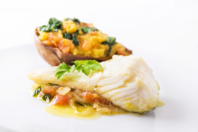13. Servir de imediato o Bacalhau grelhado com a açorda de tomate.