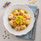 3. Servir com o Miolo de Camarão de Moçambique salteado, salpicado com cebolinho picado.