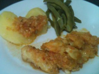 3. Numa travessa forre o fundo com as fatias de pão, coloque as batatas, os grelos, os lombos e os ovos cozidos cortados às rodelas.