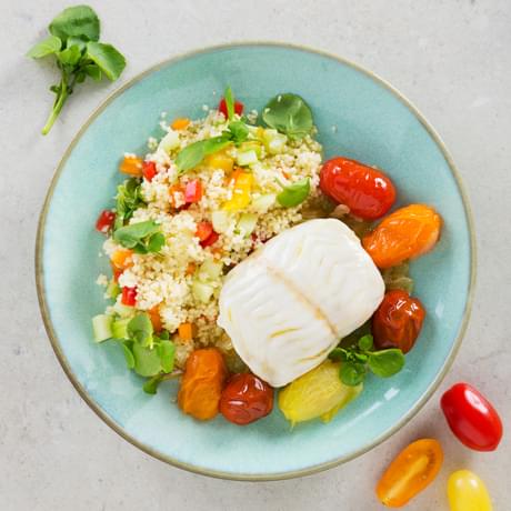 4. Servir os Medalhões de Pescada com o tomate tricolor e a salada de cuscuz.