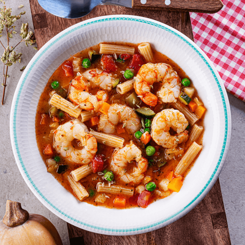 Uma sopa rica e completa, com vegetais, massa e camarão, perfeita para aquecer o corpo e trazer conforto à mesa com um toque de frescura do mar.