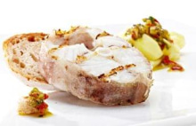 . Enquanto isso, para preparar a salada, misturar numa saladeira as folhas de espinafres baby, a manga em cubos, a cebola roxa em meias luas finas e o feijão preto previamente salteado em azeite e alho picado. Temperar com sal, azeite e sumo de lima e servir com as Postas de Pescada assadas.