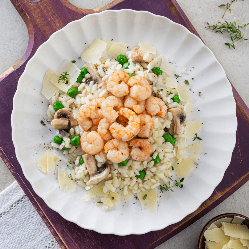 Quem procura uma refeição equilibrada e sofisticada, com camarão salteado, arroz cremoso e legumes frescos.